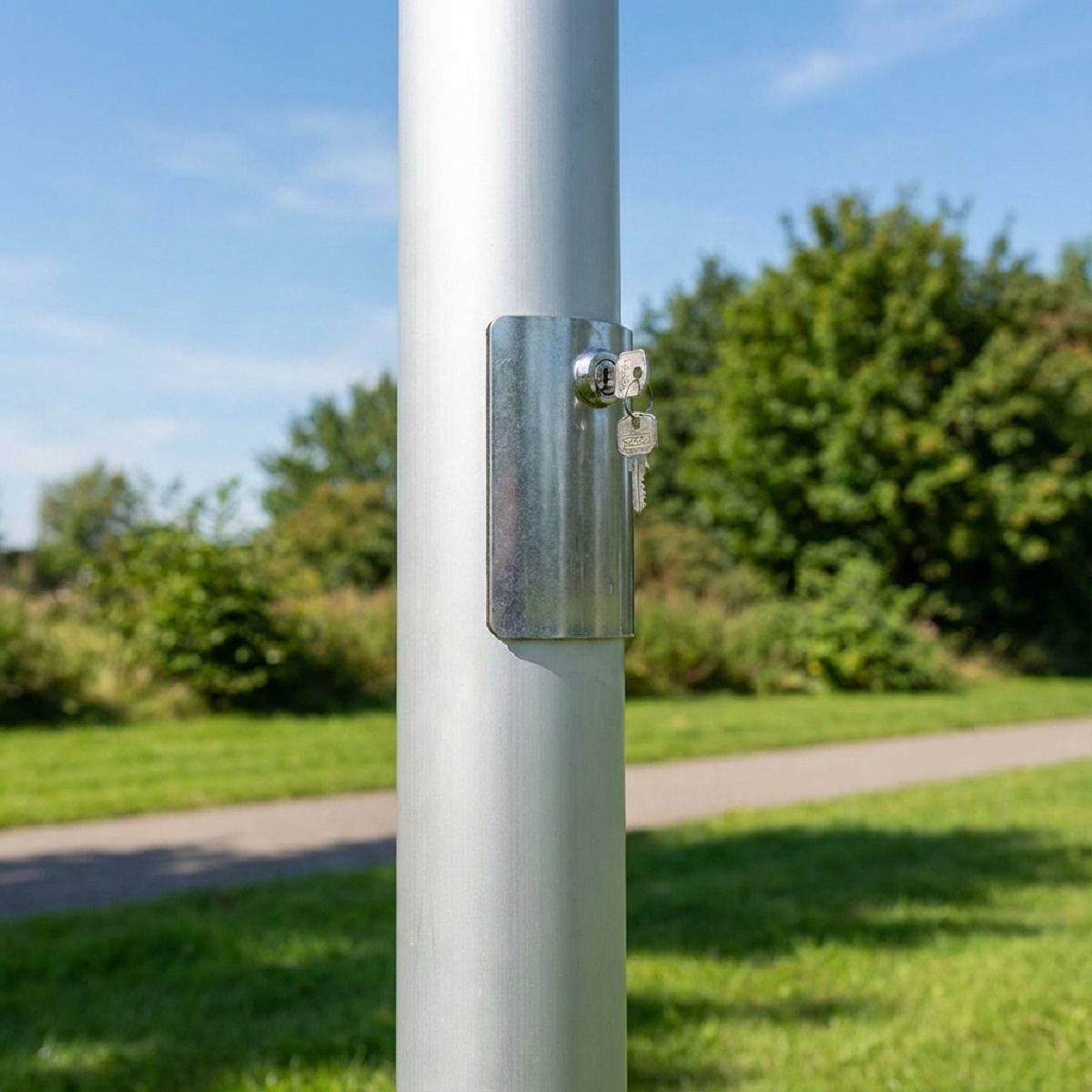 Die Fahnenmast-Tür wurde speziell für WEBA-Fahnenmasten entwickelt und ist in zwei Größenvarianten erhältlich. Die präzise Passform sowie die integrierte Öffnung für die innenliegende Seilführung gewährleisten einen sauberen Sitz und funktionalen Zugang. Das mitgelieferte Schloss schützt zuverlässig vor unbefugtem Zugriff – ideal für häufig frequentierte Standorte oder öffentlich zugängliche Anlagen.