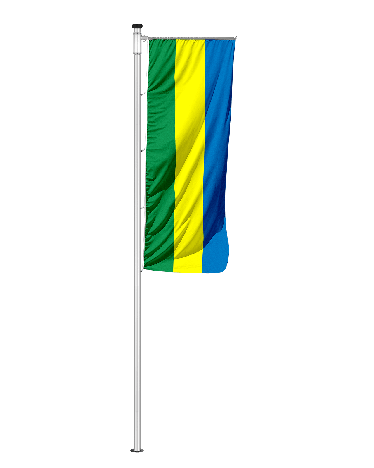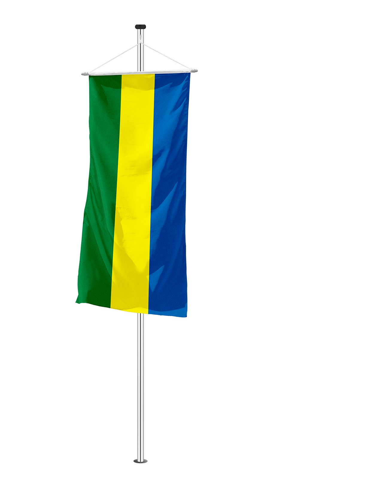 Die Befestigung erfolgt über eine stabile Queraufhängung, optional ergänzt durch eine Ringsicherung. Dadurch bleibt die Flagge auch bei wechselnden Wetterbedingungen sauber in Position und vermittelt einen professionellen Eindruck.