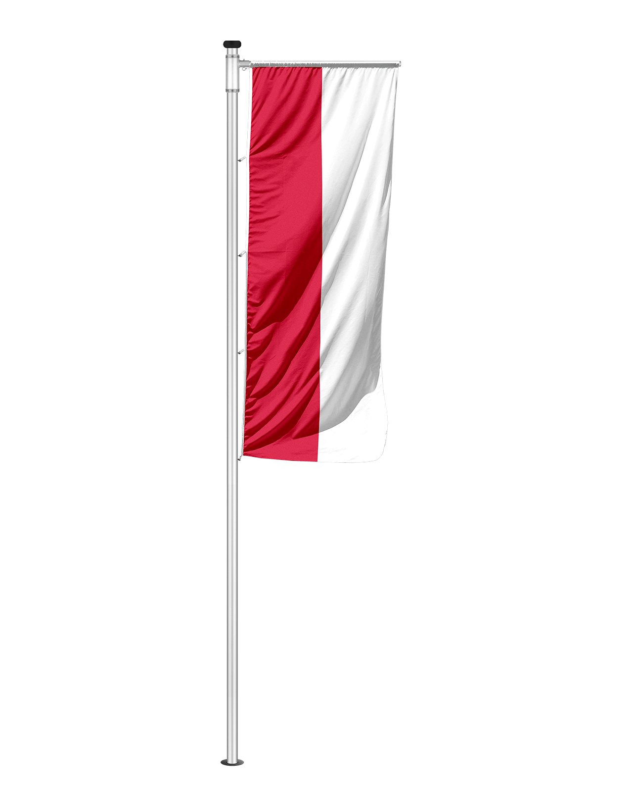Die Befestigung erfolgt über eine stabile Queraufhängung, optional ergänzt durch eine Ringsicherung. Dadurch bleibt die Flagge auch bei wechselnden Wetterbedingungen sauber in Position und vermittelt einen professionellen Eindruck.