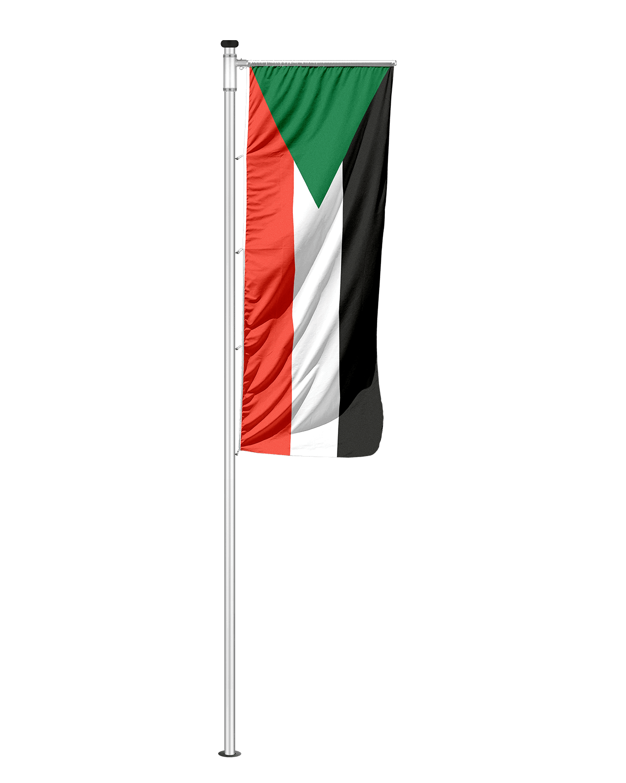 Die Befestigung erfolgt über eine stabile Queraufhängung, optional ergänzt durch eine Ringsicherung. Dadurch bleibt die Flagge auch bei wechselnden Wetterbedingungen sauber in Position und vermittelt einen professionellen Eindruck.