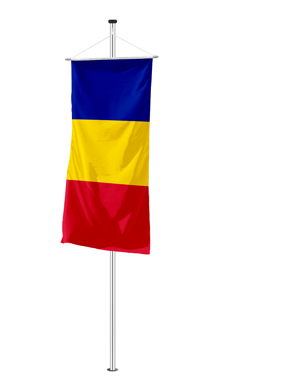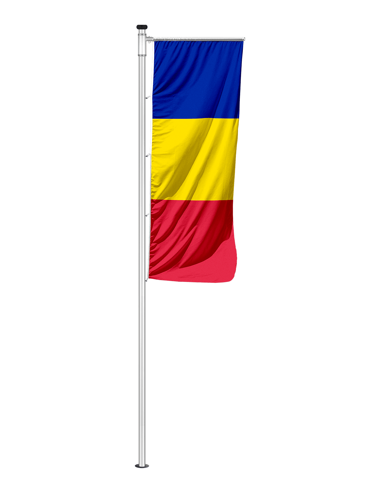Die Befestigung erfolgt über eine stabile Queraufhängung, optional ergänzt durch eine Ringsicherung. Dadurch bleibt die Flagge auch bei wechselnden Wetterbedingungen sauber in Position und vermittelt einen professionellen Eindruck.